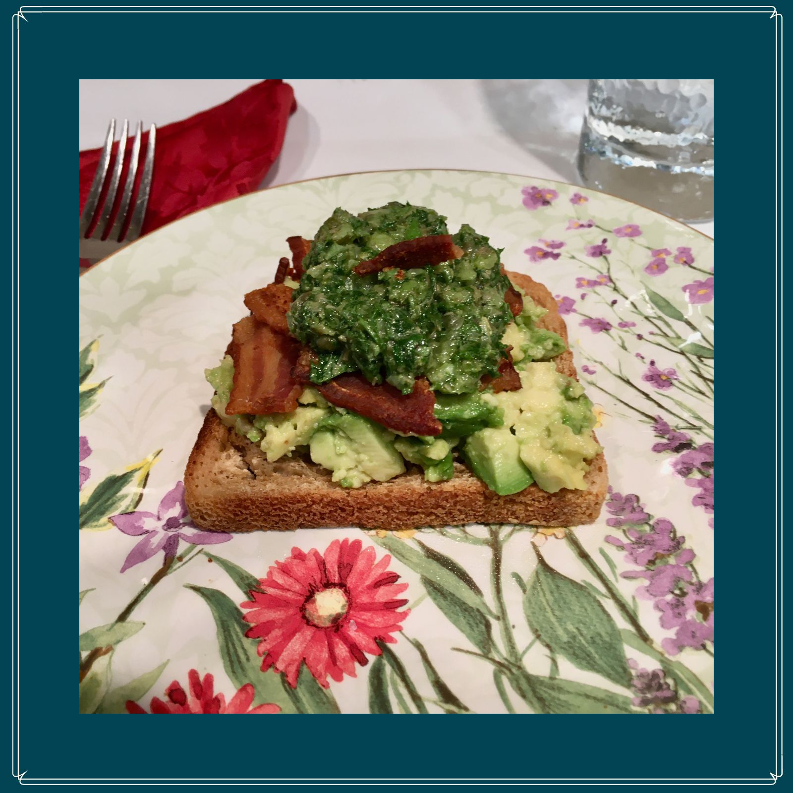 Spread the avocado on toast. Top with crumbled bacon.