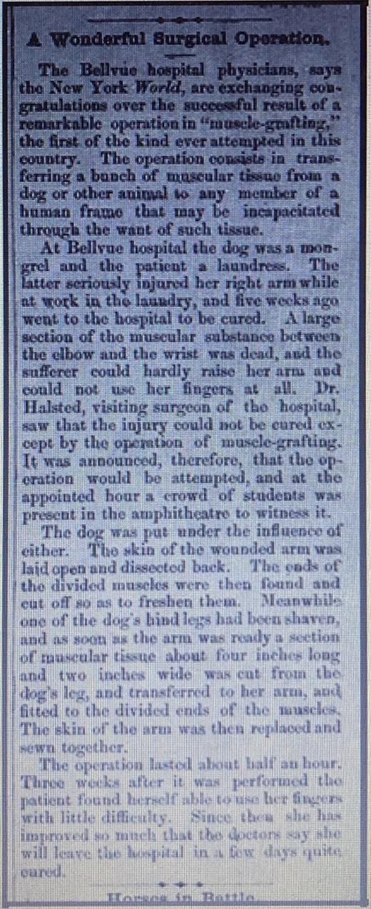 Essentially, a woman suffered a severe crushing injury at her work as a laundress, which left her unable to use her right arm. Halsted’s solution was to replace the crushed muscle with a graft from a dog. (“At Bellvue hospital the dog was a mongrel and the patient a laundress.” Disturbing that the dog gets top billing.) The operation is described and success is reported. She was expected to be discharged “quite cured.” I very much doubt it. But it certainly was a bold thing to try.