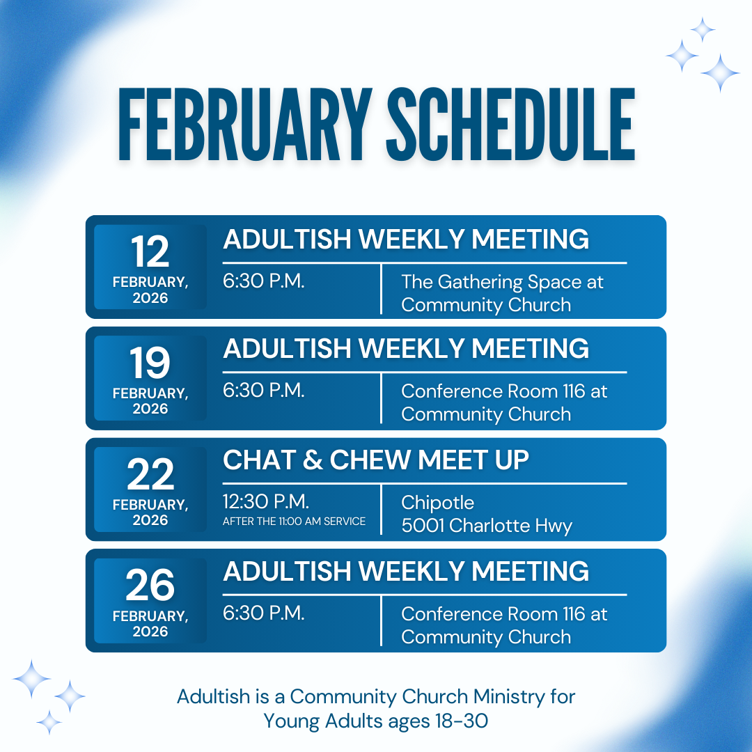 Our heart for Adultish is that those who come will grow into faithful, available, serving, and teachable disciples of Jesus together with a christ-centered community supporting them. Come as you are, bring your questions, and donât feel like you need to have it all figured out.