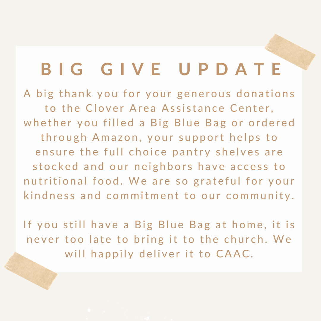 Clover Area Assistance Center (CAAC) prevailed on CCLW to install a mini pantry (Blessing Box) in 2023. The canned goods left in the box are intended for the local homeless as well as families who need help stretching their food supply. The Blessing Box is on the parking lot side of our church (follow the signs from Highway 49).