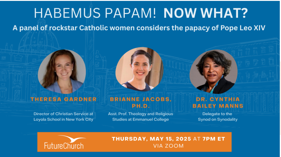 As the papacy of Pope Leo XIV begins there are many questions being raised. Join FutureChurch on May 15th at 7:00pm ET as we welcome an expert panel who are well positioned to offer valuable insights about what may be next for our Church and our world.