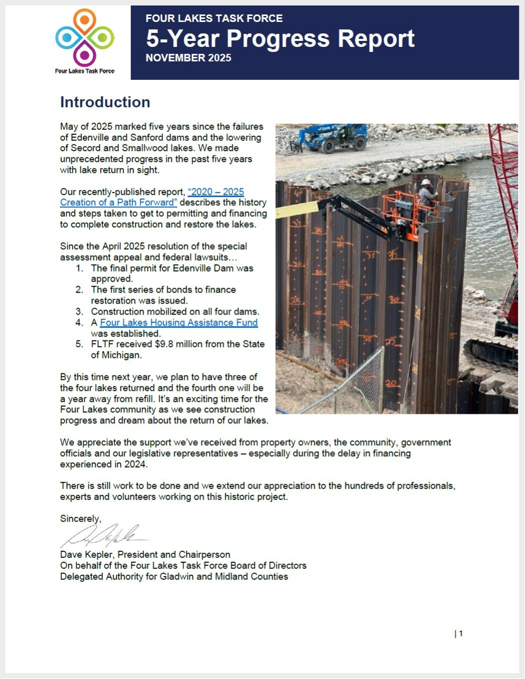 May of 2025 marked five years since the failures of Edenville and Sanford dams and the lowering of Secord and Smallwood lakes. We made unprecedented progress in the past five years with lake return in sight.